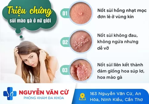 – Không gây ngứa, đau, hoặc sưng tấy thường mọc đơn lẻ hoặc thành cụm tại âm đạo, bẹn hoặc vùng mu.