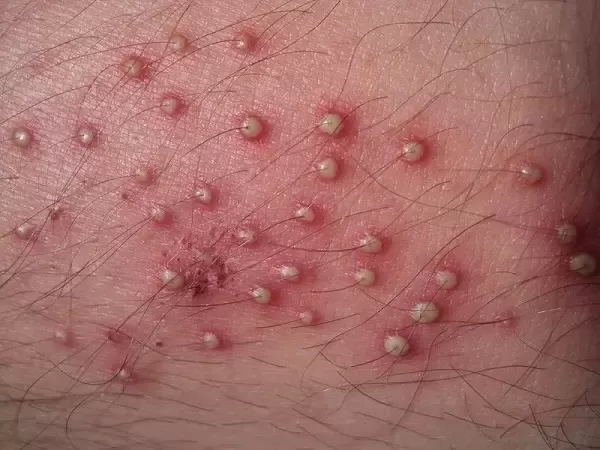 – Ngứa nhiều, nổi mẩn đỏ, xuất hiện mụn nước nhỏ có thể vỡ và đóng vảy
