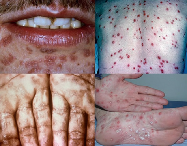 Bệnh giang mai có diễn biến rất phức tạp và dấu hiệu nhận biết không rõ ràng. Biểu hiện bệnh là các vết loét, ban đỏ tại nhiều bộ phận trên cơ thể như lòng bàn tay, lòng bàn chân, bụng, ngực… nhưng thường tự biến mất sau 3 – 6 tuần. Ở giai đoạn cuối của bệnh hoa liễu này, virus sẽ xâm nhập vào các cơ quan nội tạng và gây biến chứng nguy hiểm như: rối loạn ý thức, ảo giác, mù lòa, đột quỵ, tử vong…
