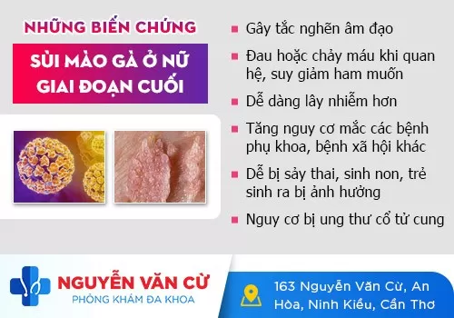 Bác sĩ chuyên khoa bệnh xã hội khuyến cáo: Khi có dấu hiệu nghi ngờ mắc sùi mào gà hoặc đang mắc bệnh thì bạn nên chủ động thăm khám càng sớm càng tốt. Bởi, sùi mào gà có thể dẫn tới những hệ lụy: