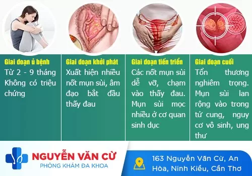 Đây là căn bệnh xã hội nguy hiểm, lây lan qua đường quan hệ tình dục không an toàn. Sau thời gian ủ bệnh từ 2 – 9 tháng kể từ khi có tiếp xúc trực tiếp với mầm bệnh các nốt u nhú, mụn thịt sẽ bắt đầu xuất hiện tại cơ quan sinh dục. Sau khoảng thời gian ngắn, các nốt sùi này sẽ phát triển to, liên kết lại với nhau thành từng mảng, trông giống như hoa mào gà hoặc hoa súp lơ, bề mặt sần sùi, khi sờ vào sẽ có cảm giác như cục thịt thừa mọc ở âm đạo.