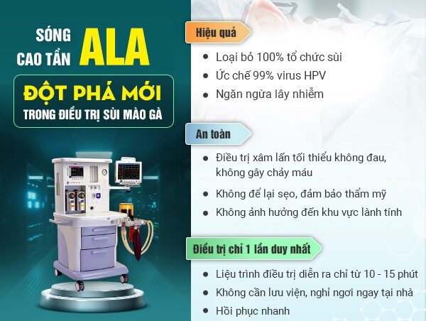 - Phương pháp ALA – PDT thế hệ 3 ra đời là một bước đột phá mới trong chữa trị sùi mào gà có thể tiêu diệt tận gốc mụn sùi, virus gây bệnh mà không tiềm ẩn nguy cơ, tác dụng phụ cho người bệnh.
