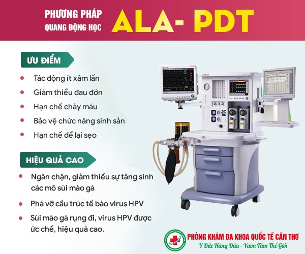 Hiện tại Phòng Khám Đa Khoa Nguyễn Văn Cừ áp dụng phương pháp ALA – PDT thế hệ 3. Đây là phương pháp điều trị sùi mào gà được các chuyên gia Y tế trong và ngoài nước kiểm chứng là hiệu quả nhất hiện nay. Đây là phương pháp dùng để phá hủy mô đích một cách chọn lọc, hạn chế tối đa tổn thương mô lành. Phương pháp này sử dụng ánh sáng để kích hoạt các phân tử nhạy sáng trong mô bệnh, phản ứng sinh ra các phân tử oxy hóa mạnh gây phá hủy tế bào đích.
